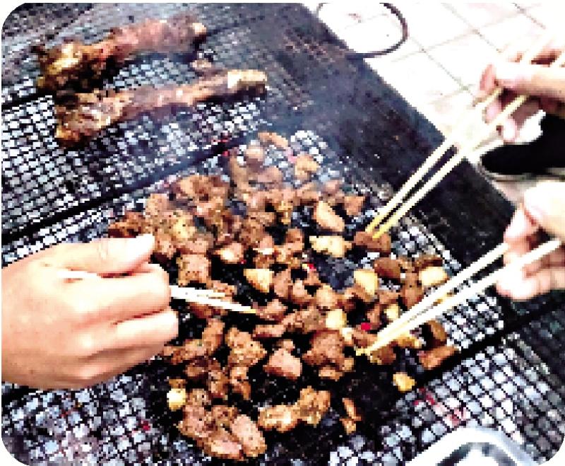 烤具三百六十五天架在院子里,随烤随生火。木炭点燃,羊肉用刀划十字刷上调料,待木炭初燃烟头过后将羊腿置炭火上,继续刷料不停翻动,烤至肉没了血丝,割肉剔骨,因之前划过十字所以割下的肉是一颗颗粒状,再把肉粒在炭火上简单翻炒几下,扒拉到一边即成。