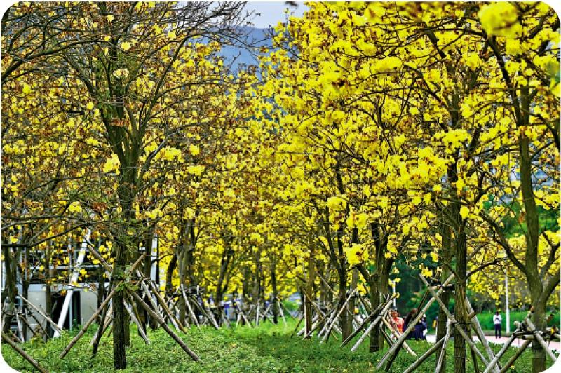近日,香港春天温暖湿润,位于香港国际机场的黄花风铃径花开灿烂,吸引游人前来拍照。图为黄花风铃木花开之际。\中新社