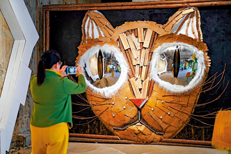 图:图为参观者拍摄用废纸皮等材料制作的《重塑猫生》。\中新社