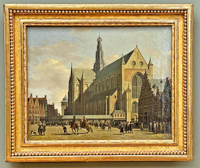 赏罢哈尔斯博物馆,拐弯又去了趟全荷兰最古老的泰勒斯博物馆(Teylers Museum),和期待值略有偏差,准备去圣巴夫教堂结束当天的行程并赶往海牙入住。把地址给了司机,由于距离不远十几分钟就到了。进了教堂我就开始找,结果转遍了我都没找到哈尔斯的安息之地,百思不得其解。回到车上和导游研究原因,后来我俩才发现,哈勒姆市竟然有两个圣巴夫教堂。我刚转完的是十九世纪末建的,叫新圣巴沃(New Bavo)教堂;而哈尔斯则葬在修建于十五世纪、坐落在老城中心广场上的圣巴夫大教堂(Sint-Bavokerk),也就是出现在乔布.贝克海德画中那栋恢宏的建筑。讽刺的是,距离刚去过的哈尔斯博物馆走几步路就能到。跑错地儿了,火速“转场”。