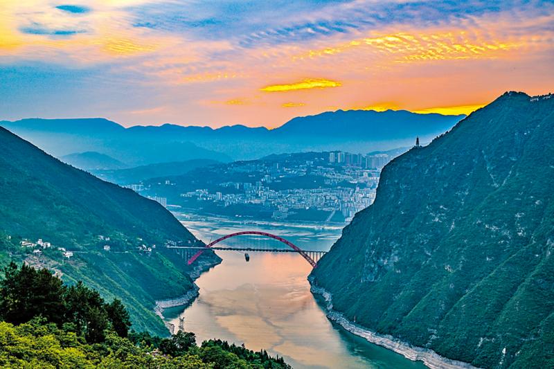登上巴东县城的大面山顶,可以俯瞰美丽雄奇的巫峡口,只见那两岸青山连绵起伏,间或高楼林立,十里长街伴江逶迤,凤凰涅槃的新城一派祥和,废墟上建起的一流足球场上,一群青少年踢得正欢;横跨大江的巍峨长桥像一道勾勒峡江天空的彩虹,江面上万吨货轮稳稳行驶,画舫邮轮怡然而行。夜色来临,璀璨的人间灯火花团锦簇,分外明亮,从外地来此的朋友们纷纷惊叹,这巫峡口犹如仙境。