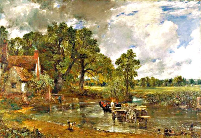康斯特布尔没理会外界的杂音,一直保持自然和清新的艺术风格,潜心追求他心中的朴素之美。比如他经常不合时宜地将风景描绘得非常整洁干净,与他同时代极受欢迎的画家所青睐的破败乡村风格形成鲜明对比。其中部分归因于他从青少年时期起,生活就被拿破仑战争所主宰,而法国大革命则引发了令人担忧的血腥社会改革的可能性。再加上欧洲各地农作物歉收、农地私有化、工业化和城市化等影响,有些人比如康斯特布尔,选择坚持永恒的乡村安乐场景所提供的令人欣慰的确定性。反映在绘画上,如果说席里柯和多数时刻的透纳代表了破坏性的自然,那么康斯特布尔代表了舒适、健康的自然。