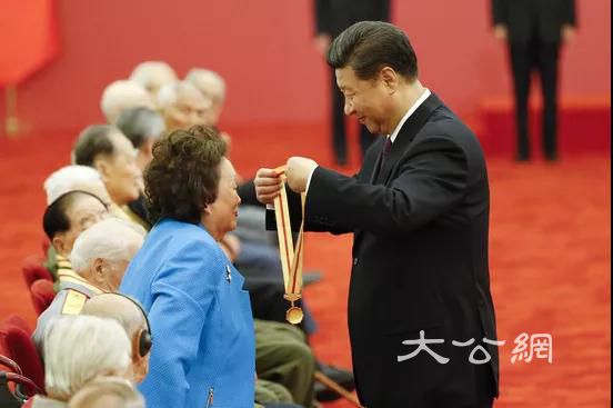 图:2015年9月,国家主席习近平向陈纳德将军的夫人陈香梅颁发纪念章(中新社)
