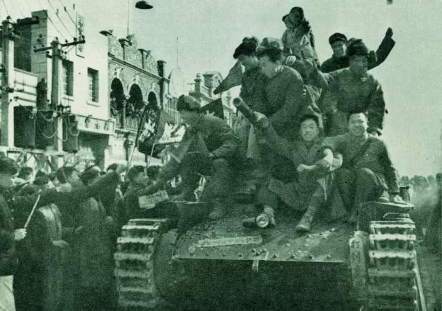 图:北平市民与人民解放军坦克手热情握手,表示欢迎