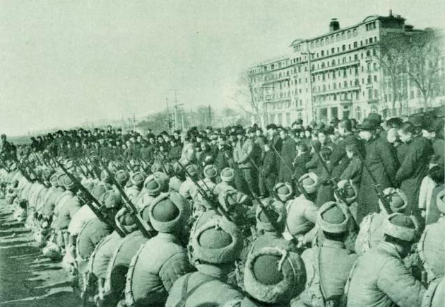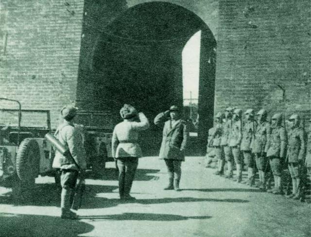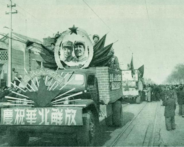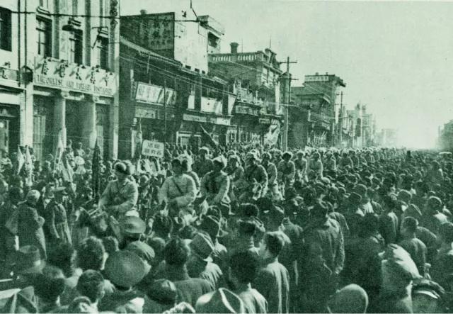 图:人民解放军进驻北平,军纪严明,军容整齐,受到北平市民称赞