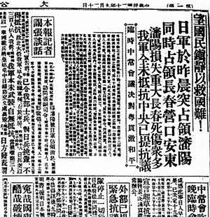 两个月后,九一八事变爆发,大公报第一时间独家报道了这一消息。张季鸾于次日便写就社评《日军占领沈阳长春营口等处》并于二十日刊登。当时国内舆论对于事变尚不甚明了,张季鸾则明确指出:“迩者国难方排山倒海而来,国力则已届气虚极弱之境……今则事实俱陈,炮火相迫,再不觉悟,更待何时?……哀悼死难同胞,警惕未来变局,举国一致,以当大难。”