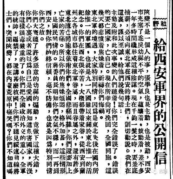 在回顾大公历史时,常会谈到在西安事变的和平解决中,《大公报》发挥的促进作用。西安事变发生之后,张季鸾忧虑国难当头,事变可能引发内战,不仅百姓再陷水火,更会削弱中国实力,给日本以可乘之机。于是在1936年14日至26日,张季鸾连续撰写了四篇社评,18日发表的《给西安军界的公开信》,是最著名的一篇。在这篇传世之作中,张季鸾一方面对颠沛流离的东北军将士寄予无限同情:“全国悲痛国难,你们还要加上亡家的苦痛”;另一方面用主要的篇幅奉劝“大家同哭一场!这一哭,是中华民族的辛酸泪,是哭祖国的积弱,哭东北,哭冀东,哭绥远,哭多少年来在内忧外患中牺牲生命的同胞!你们要发誓,从此更精诚团结,一致的拥护中国。”刊载这篇社评的《大公报》,当即被国民政府翻印数十万份用飞机空投西安军界。