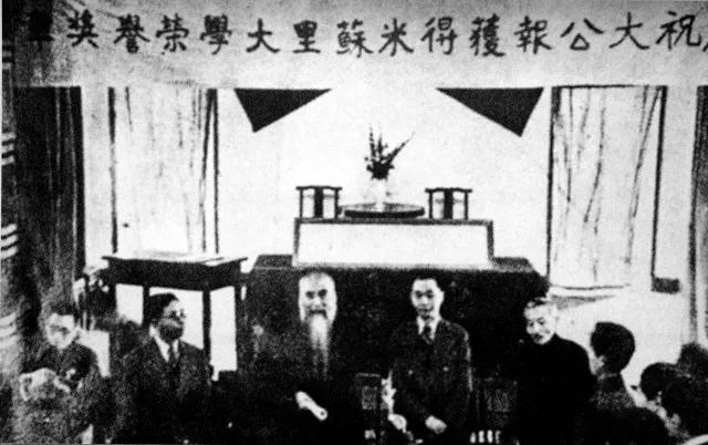 1941年,大公报荣获米苏里奖,张季鸾(左五)、于右任(左三)在庆祝会上