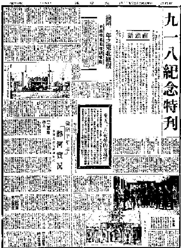 “九一八纪念特刊”版面中央刊登这样一段文字:‘九一八’事变转瞬两年,在这两年里不知道有多少忠勇的将士、忠勇的民众、忠勇的男女青年,惨烈地牺牲于强敌猛烈的炮火之下。一个民族应该延续他悠久的生命,一个民族应该表征他伟大的精神。我们的心在跳跃,我们的血在奔流,我们虔诚的对这次为民族的光荣而惨烈牺牲的英魂,深致我们的敬崇,深表我们的哀忱。”