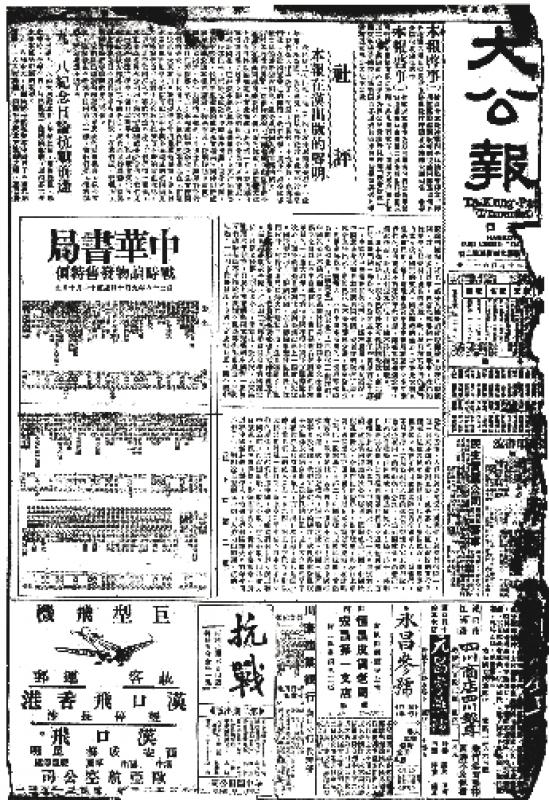 就连广告,也与大公报“明耻教战”的方针一以贯之。汉口版首期头版刊登了约四分之一版中华书局的战时读物发售广告。书目包括《日本在华经济势力》《东三省之实况》《太平洋上的争霸战》《近代中日关系略史》《国防与潜艇》《毒气战争与防御法》等。一切为了帮助国人了解战争,了解日本,了解世界,而能自强自立,求取胜利。