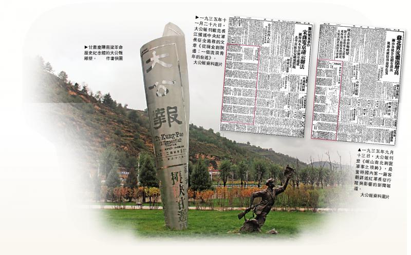 第二件事,便是著名的“一张报纸定乾坤”。在现在甘肃宕昌县哈达铺镇(旧属岷县),悬挂着“大公报发现地邮政代办所旧址”的红色匾额。哈达铺纪念馆里,有毛泽东等人共同手持大公报阅读的雕像。甘肃庆阳南梁革命历史纪念馆的草坪广场上,则耸立着一张大公报造型的大型雕塑。这些,都是对大公报历史作用的高度肯定,是对那段艰辛岁月的永远铭记。