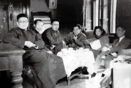 20 世纪40 年代,徐盈在重庆《大公报》工作期间与同事们在一起。左一为社长王芸生,左三为徐盈,左四为名记者高集