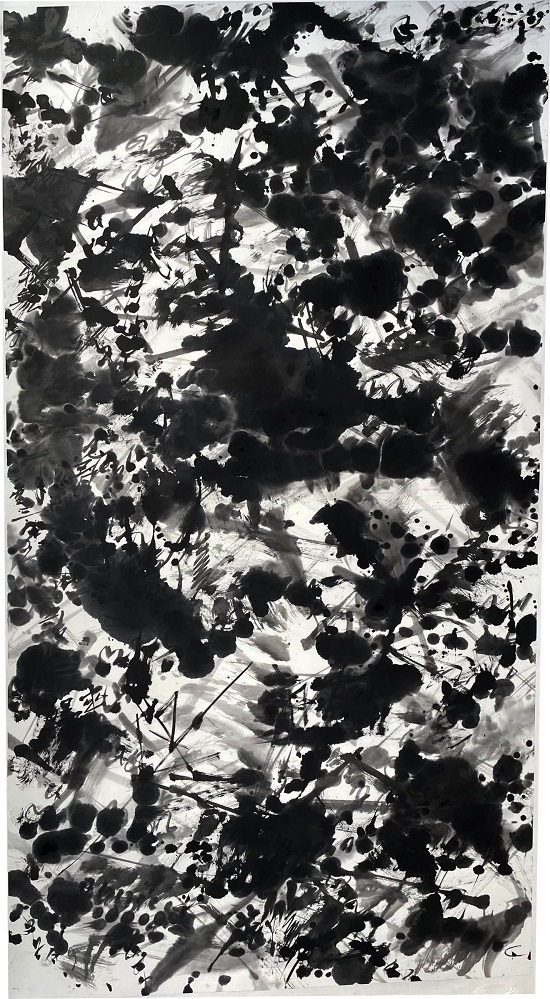 由“借院三法”共同演绎的《大开宇宙—幻化西塞山》是光境画风“爆笔炸墨”的代表作。它如宇宙星际大爆炸,充满了神奇的自然力量,气势磅礴,境意高远,韵味无穷。鼓气—张力—爆炸。乱柴如剑舞,寒光凛冽,直逼纸面,光和境叠交恍惚。蕉叶如帚狂扫,光被折直为曲,境则幽寂深邃、曲折奇异。雨点飞溅,铺天盖地如陨石,曲光又被撕成碎片。境因光幻,光因境化,光与境重叠和交集。