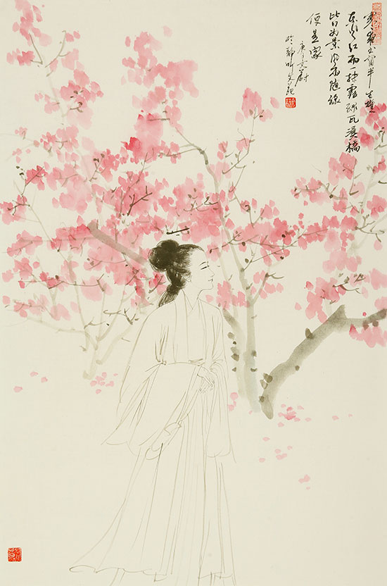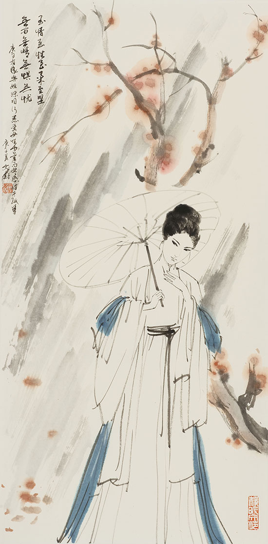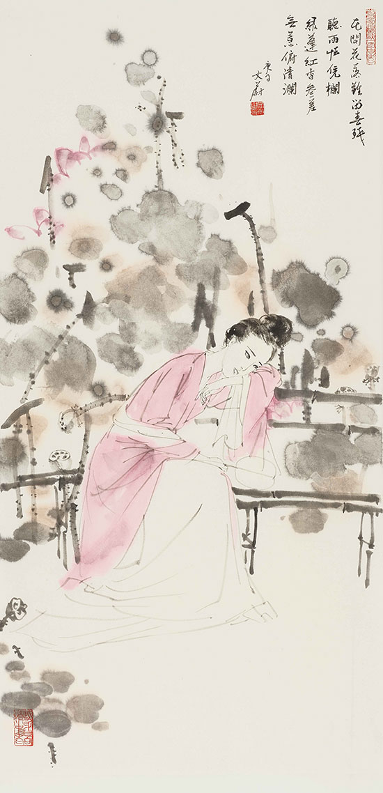 庚子年以来,随着《笔下红豆疏》、《无意俯清澜》、《忆香》等一系列描绘仕女闺房诗意画的出现,文蔚的仕女画风格正式形成。其笔下的仕女,或是倚竹而立的知性丽人,或是相思情深的闺怨,她们或转身回眸、或仰头张望、或俯首沉思、或满心期盼。文蔚在运笔上追求速度与力度,设色如烟如雾,写意飞动,从而使人物临风摇曳,服饰也随之自然飘逸——无论是复杂或简练的画面,都有种诗的回味与韵律。
