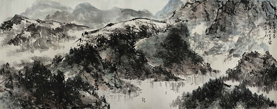 中国传统山水画讲究“可居”、“可游”,文蔚的山水大写意画,多以积墨的深渊大壑、陡岩峭壁为主题,笔下的山体传达出雄强刚毅的气息。大笔的淡墨,泼洒出远山、云气,干粗的大笔,随意地勾勒出山的轮廓,又挥发出画家的恣意豁达。而大山脚下的瀑布、飞流、小桥、流水、人家和柿树、飞鸟,这些中国画的传统元素,可以看出画家的个性。