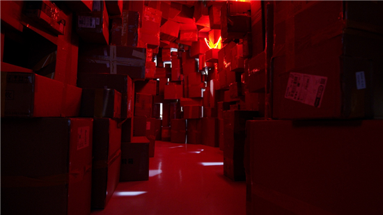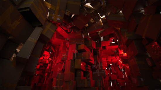 《即时的洞穴》,尺寸可变,快递纸箱、声音播放器、霓虹灯、木,2021-2022