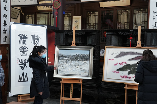 捐赠作品展示,左起:大觉先生创作的《北京冬奥福满人间》、东方啸先生创作的《早发白帝城》