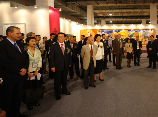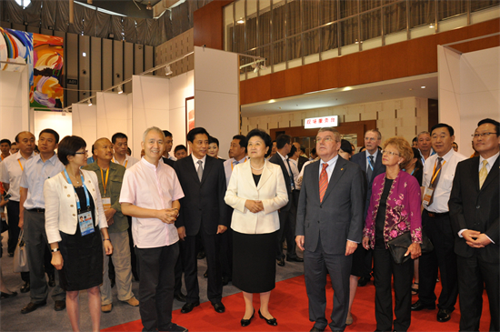 策展人白十源先生陪同时任国务院副总理刘延东、国际奥委会主席巴赫、国际奥委会名誉主席罗格等参观2014南京青奥会美术大展