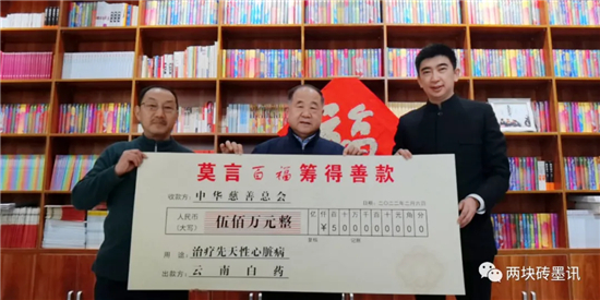 春节前,我们捐赠百福所筹善款五佰万元已到中华慈善总会账号,春节期间在荣宝斋网上拍卖五福所得善款贰拾肆万贰仟元不日也将到账,为救助西部地区先心病患儿的“莫言同心”项目已在慈善总会立项,今后此项目将持续不断地对先心病患儿给予帮助,希望文友墨朋继续支持我们。