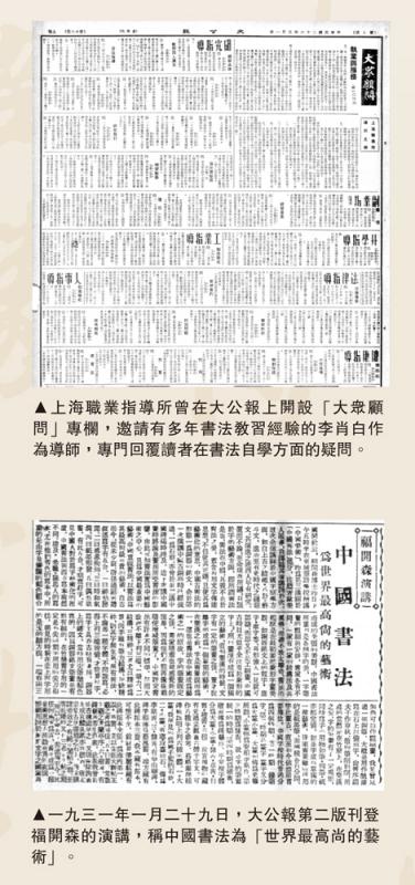图:(上)上海职业指导所曾在大公报上开设“大众顾问”专栏,邀请有多年书法教习经验的李肖白作为导师,专门回复读者在书法自学方面的疑问。(下)一九三一年一月二十九日,大公报第二版刊登福开森的演讲,称中国书法为“世界最高尚的艺术”。