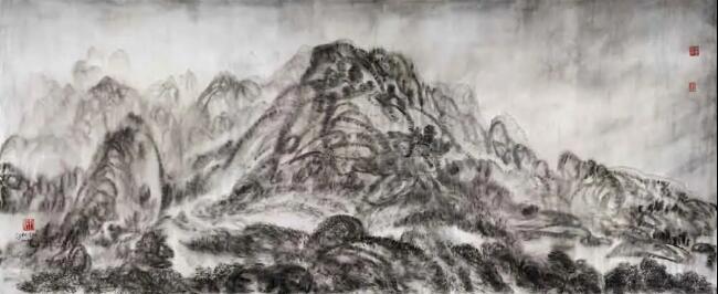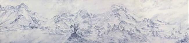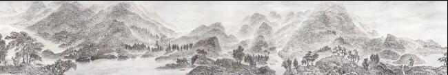 近些年来,他的“经典图式+笔墨再创”系列作品令画坛耳目一新。特别是此次展陈的富春山居再创系列水墨卷全卷(画面长度17.4米)、青花卷全卷(画面长度13.5米),以及春雨卷、书写卷的局部画面。各卷均是在黄公望《富春山居图》的基本图式上进行“再创”,尹毅在反复欣赏这一经典画面时联想到:若画面中的富春山客现存在,虽然其型体会千年不变,万年不变,但是其景色却会伴随着一年四季、一天二十四时的轮回无休无止的变化,而且还有艳阳、月光、云雾、雨雪笼罩下的环境之变……这世界上的山山水水展现出了无穷无尽的客观画面,为人类的艺术创作提供了丰富的资源。何况伴随着时代的变化,人类的内心世界与审美观念也在变,艺术家的创作理念、表现方式、艺术语言也在变。所以尹毅要在黄公望的经典图式基础上表现同一景观的千变万化之美。尹毅的这几幅代表性作品长卷,在取法前人精髓的基础上融入了时代的气息,并以当代审美观念展现出了传承与创新并举的特色。