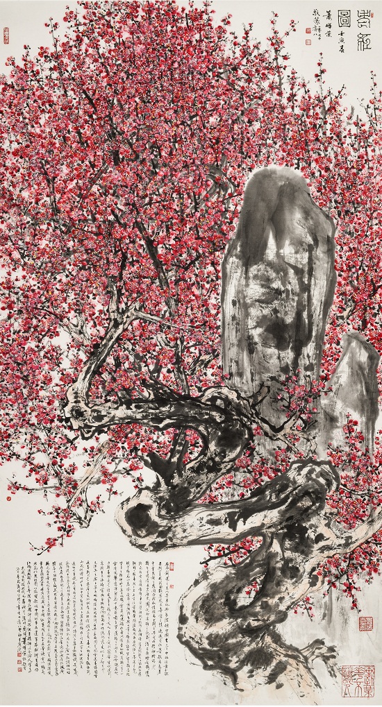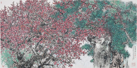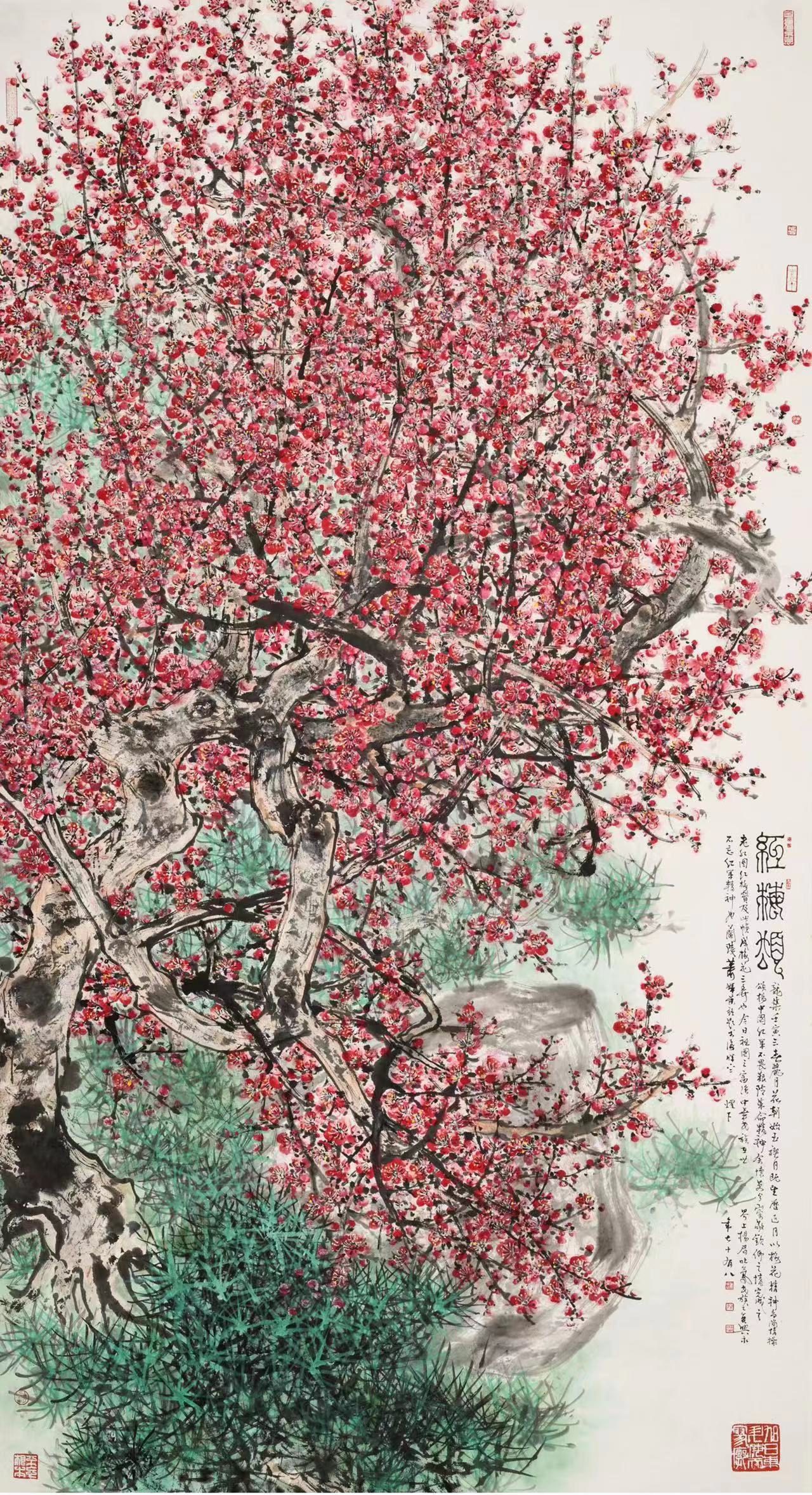 萧晖荣教授具有全面而卓越的艺术才能,其中国画在继承传统笔墨精神的同时勇于创新,独具风格特色,在画面布局、色彩乃至文人内涵等方面均多有创造。尤其是他的梅花图,常以梅花的繁茂景象譬喻今日民族崛起国家兴盛的和谐盛世,予人以强烈的视觉冲击与丰富的情感体验。萧教授将其所作梅花组画展出,其《梅花三弄》系列作品,以《红梅赞》《老红图》与《梅花颂》三幅作品颂扬红色经典,歌颂红色革命精神,以表对中华民族伟大复兴之欣喜,对祖国繁盛之祝愿。