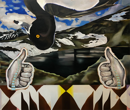 耿旖旎,背叛的山脊-旧毛衣, 布面油画,善良的凤头潜鸭倒立在北极雪原的白夜(受访者供图)