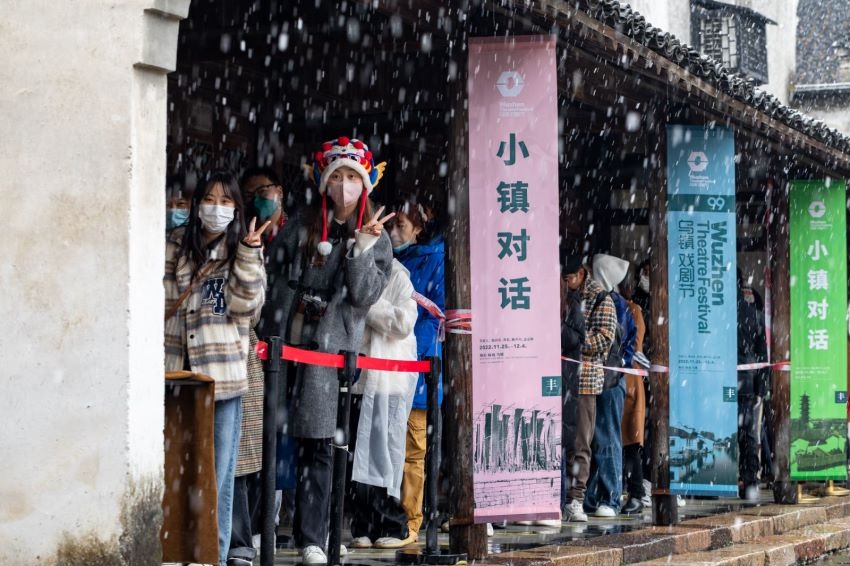 乌镇戏剧节举办九年以来,今年第一次邂逅漫天飞雪,漫步在乌镇飘雪的石板路上,街头巷尾依然人头攒动。在青年竞演的蚌湾剧场的门口、小镇对话的西栅评书场的外面,依然有人撑着伞,在飘雪中飞雨中排着队,期待能候补进入内场,去亲身聆听戏剧名家的对话,感受青年竞演的热力,挖掘自我成长的乐趣。