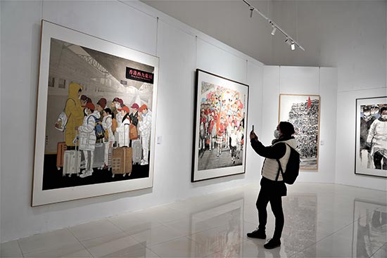 观众在“庆祝香港回归祖国25周年美术作品展”展览现场参观。/记者 郭若溪摄