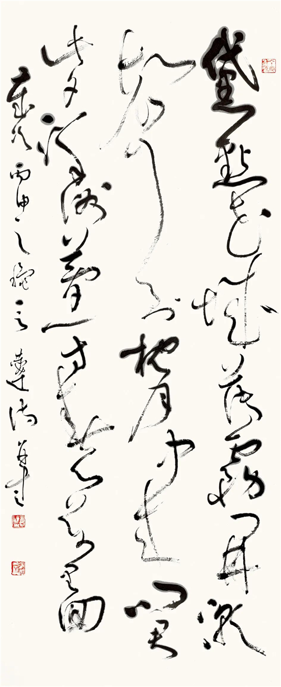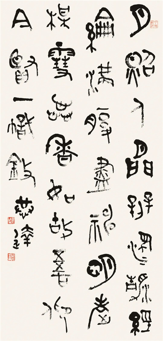 下面来谈谈言先生书法的当代价值。 言先生书法的当代价值,简而言之,是一种“古典性”在当今的再现,进而言之,是保留了传统书法的核心精神并在这种精神指导下的创新方式。主要表现在以下三个方面: 一是独特的用笔方法。我们知道书法最大的核心之一是用笔,笔法决定了书法的专业程度和水平、境界的高下,以及风格的形成,当然,用笔也受到外在如毛笔、纸张、书体以及理念的影响。我们看到言先生的书法所具有的独特书风,与其独特的用笔方法是分不开的,在以中锋为主的用笔基础上,中、侧锋互用,并伴随着裹锋、涩行的互用,以适应长锋羊毫和生宣纸等工具、材料的特性。这种用笔方法在其正书如甲骨文、篆书和隶书中使用,难度不算很大或不甚明显,但运用于行草书特别是大草的创作,既要保持线条的质量,又要保持中锋的任意挥写;既要克服纯羊毫特质,又要借助生宣纸的晕化,保持裹锋、涩行的用笔方法,并将这些矛盾一一化解难度却不小。因此,独特的用笔,使他的正书不滞不板,他的草书宁静而纯正,既高古又有新意,从古远的篆籀而来,又连接起羊毫和生宣的特性,是古典书法用笔的当代创新。 二是一根“祖线”打通书法诸体。我们对书史中有成就的书家研究后可以发现,其多种书体间都能保持风格的一致性,并有着明显的内在关系,或线条或字形或气息等,哪怕是书体相差很大,如楷书、篆书抑或行草书,但各体之间一定有着内在的联系,互相贯通、风格统一,而不是“各体为阵”、互不相干,这就是所谓的自家面貌。言先生用大篆这根“祖线”,建立起各种书体的联系,特别是他的大草,不仅与当代书家相比有着不同的风格,即便放在整个草书史上,也具有非常独特的个性,这就是古老的篆籀之线,贯穿于各种书体之间,连缀成自己的书法风格,书写出这个时代书法艺术的华美篇章。更为典型的是不管是书写擘窠大字,还是书写小字,不管是真、草、隶、篆、行诸体,还是署名之落款,都是同一支羊毫,同一根线贯于始终。他用这根篆籀之线——中国书法的“祖线”,将各种书体打通,既保持了古朴之气又呈现出各体之态,保持了整体书风的高古和遒美等统一的审美品质。 三是接续碑帖结合的创新之路。前面我们说过,中国书法、中国艺术是在自我文化系统中产生、发展、演化而来,有着稳定、自给的内在规律。“二王”帖派书法统治书坛1500年之后,到了明代末开始式微、衰败,于是碑学兴起。清代晚期随着碑学的矫枉过正,其局限性也日趋明显,有思想的书家开始走向变法,走向碑帖结合之路,并诞生了赵之谦、何绍基、吴昌硕、齐白石、黄宾虹和林散之等碑帖结合的书画大家。虽然这一创新之路受到百年来的社会动荡所干扰,但这股内在的书法演化创新之路始终存在,发挥着延续书法发展的重要作用,并决定了书法未来的发展方向。 言先生在其师沙曼翁先生的引领下,在苏州一带书法名家的影响下,在晚清以来书法大家的启示下,走向了碑帖结合之路,在扎实的甲金篆籀书法的基础上,在中国传统艺术思想特别是道家思想,如大巧若拙、大成若缺、计白当黑、反者道之动等艺术理念的指引下,融入了南宋以来金石学的成果,对清代碑学有着深刻的理解和领悟,将碑的涩、厚、重、宽、博等因素,融入到帖的流畅、典雅、映带、圆劲之中,形成了既质朴凝练又典雅峻拔,书卷之气溢满纸楮的艺术风格。更加难得的是,他的碑帖结合已经摆脱了形的外在之貌,在如甲骨、金文、小篆中,不仅保留了碑学的残缺、高古和金石的自然风化之美,而且还创造性地融入帖的自然书写性和审美的写意性,笔断意连、笔断势连、虚实相间、浓淡互用;其草书特别是大草将篆隶、碑版的金石元素融入到书写之中,利用用笔、墨色、轻重、断连等变化产生碑派之态、金石之气,以篆籀之基铸就了自己的书法艺术,形成了独特的书法风格。其显著的特点是在注重“速度、压力、节奏”的前提下,强化艺术空间意识,实现从二维进入三维的布白创变。 以上三点,既是言先生书法的基本特质,也是其在当今书坛存在的价值。今天的书坛,已不是30年前的书坛,更不是百年前的书坛,不仅各种思想层出不穷、交流激荡,而且我们对现代化的认知更加深入,特别是随着经济实力的增强,我们有必要也有物质基础去审视百年来我们走过的路,审视传统和现代的文化关系,审视我们曾经为民族存亡而奋斗,从而带来对传统文化的陌生甚至偏见,对传统书法“古典性”认识的肤浅。所以,正如日本书坛领袖高木圣雨所说:“言先生的书法,当代古典主义元素最浓,而不是表现主义。”这种“古典性”的存在,为我们阐释中国书法、中国艺术创新之路、未来走向提供了依据,不仅具有重要的艺术价值还具有独特的现实意义。