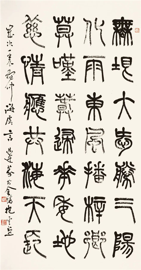 言恭达 篆书自作诗《善行天下赞》中堂 无垠大爱胜三阳,化雨东风播梓乡。莫叹春归花委地,慈情应共海天长。