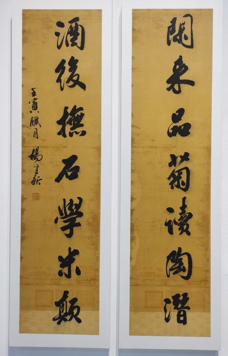 纵观本次书画展的作品,其书体或行、或楷、或隶、或篆、或草,结体规范,线条厚实,体现出作者一种认真的学习态度、严谨的学习作风。从风格上看,或厚重大气,或端庄秀丽,或刚劲挺拔,或潇洒飘逸,各有特色,异彩纷呈。展现出作者的情感抒发和审美意趣。从形式看,有条幅、中堂、对联、手卷、册页,应有尽有,法古多变,确实给人以一种美的艺术享受。