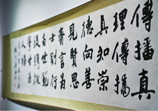 其书艺不仅经历了上溯秦汉、入唐入晋的拟古习学,更能自觉主动地从哲学、历史、文学、科学等领域中吸收养分,“取会风骚之意,本乎天地之心”,自然而然也就有了与专业书家所不同的别样意境和韵味,以及法度谨严之外的文化气象与格局,颇足打动和振奋人心。观者从中发现的,不只是中国传统文人书法字形结体的优美淡雅,更有今时今日的时代精神和情感诉求,其境界的超然和意蕴的不尽,只能用一个“韵”字来进行概括和总结。