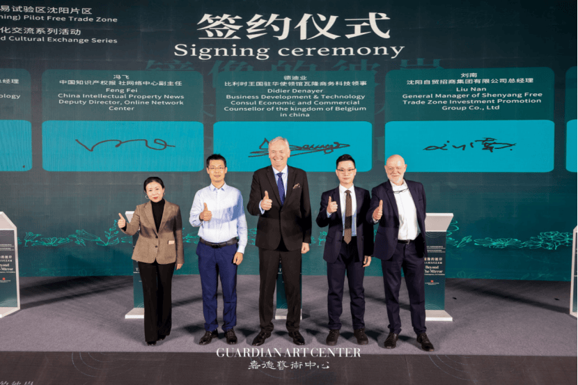 中欧经贸合作与文化交流 签约仪式(左起:辽宁易境智链科技有限公司副总经理刘一鹏,中国知识产权报、社网络中心副主任冯飞,比利时王国驻华使领馆瓦隆商务科技领事德迪业,沈阳自贸招商集团有限公司刘南,比利时列日皇家美术院院长丹尼埃尔·斯吕思)