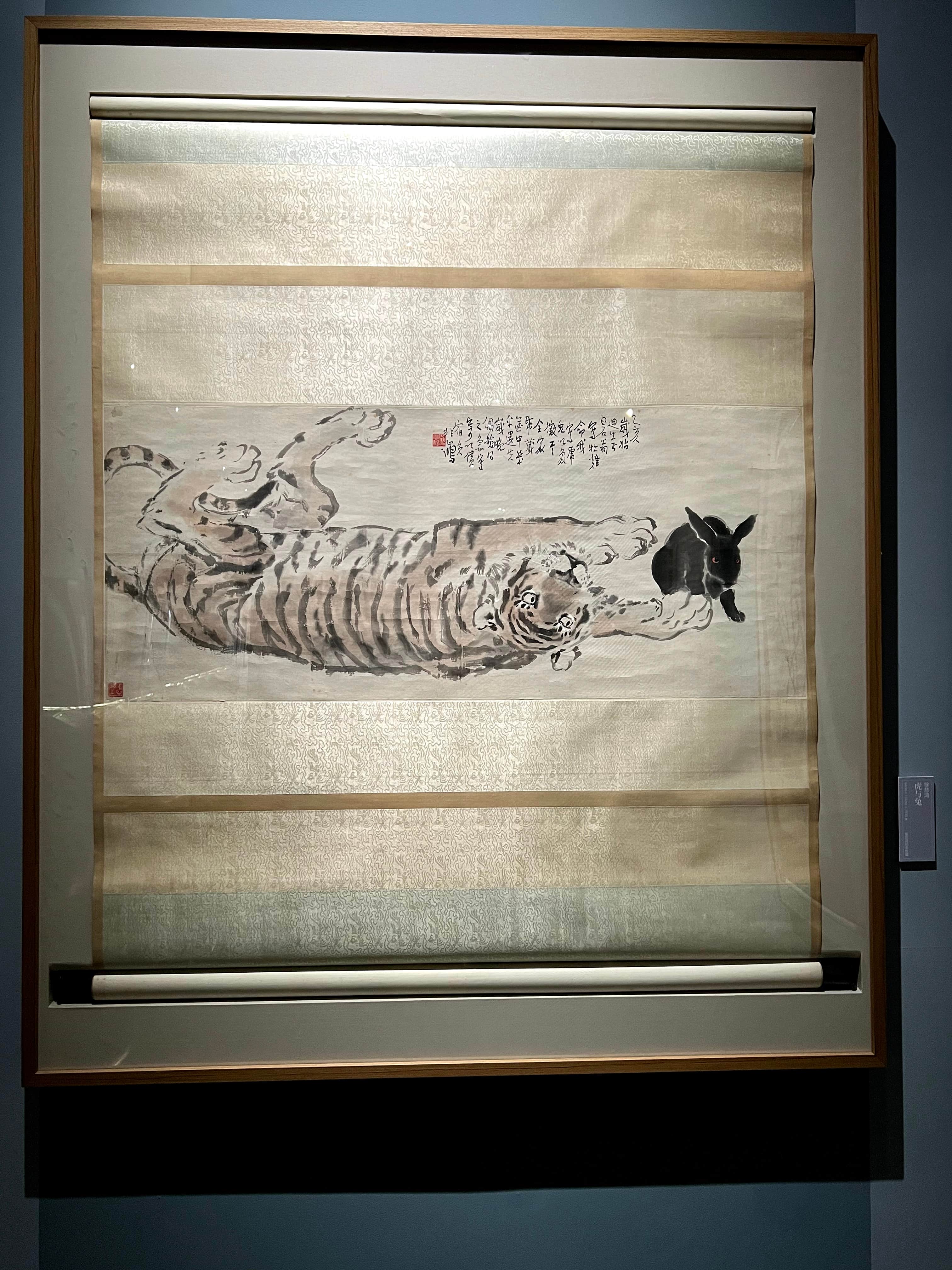 展览的“妙造奇趣”板块,充满了生活气息与幽默感。一幅由齐白石与徐悲鸿应友人之请合作的《虎与兔》尤为有趣。友人一家分属虎、兔、鸡三个生肖,其中兔、虎本为天敌。齐白石画鸡,徐悲鸿则巧妙地将兔子描绘得略显“凶猛”,而将老虎画得如憨卧的胖猫,让二者在画面中和谐共处,尽显艺术家的巧思与创造力。