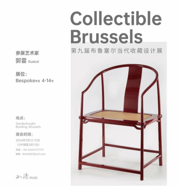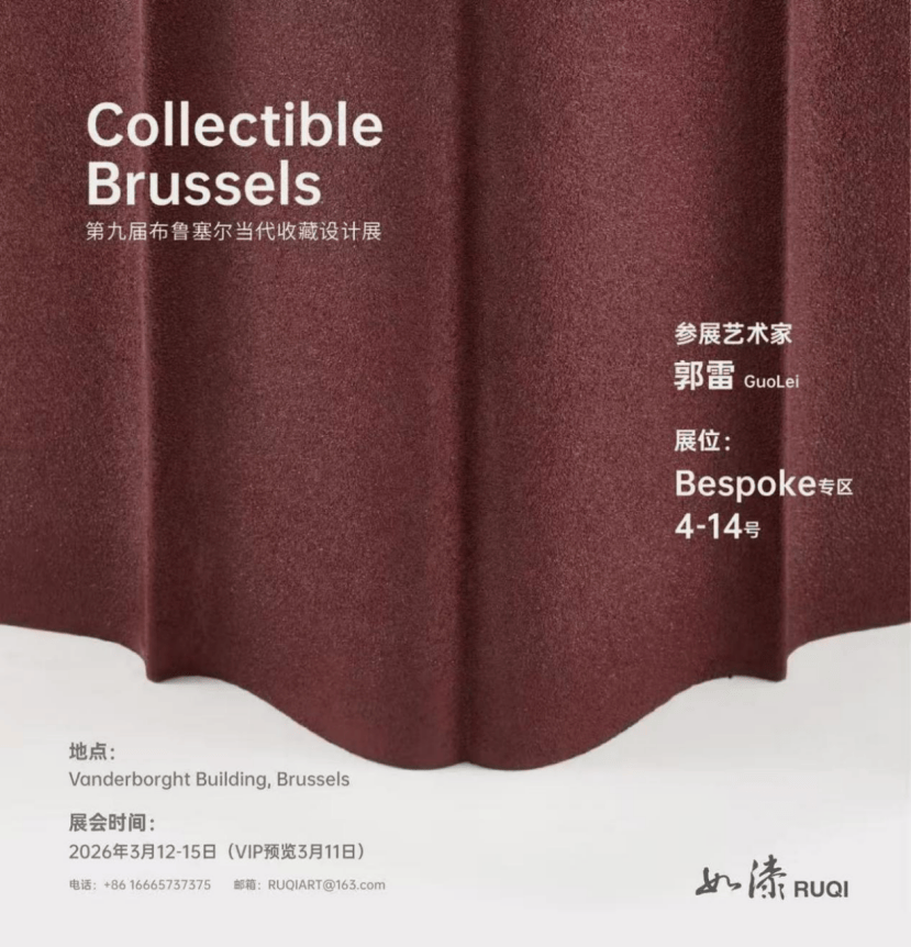 2026年3月12日,第九届 Collectible 布鲁塞尔当代收藏设计展在比利时开幕。作为聚焦“收藏级设计”的年度活动,本届展会汇集了来自全球的实验性设计作品。在位于布鲁塞尔市中心的 Vanderborght 建筑内,中国艺术家郭雷(Guo Lei)携“如漆 RUQI”品牌的系列作品首次参展,成为本届展会唯一进入 Bespoke(定制)专区的中国设计师。