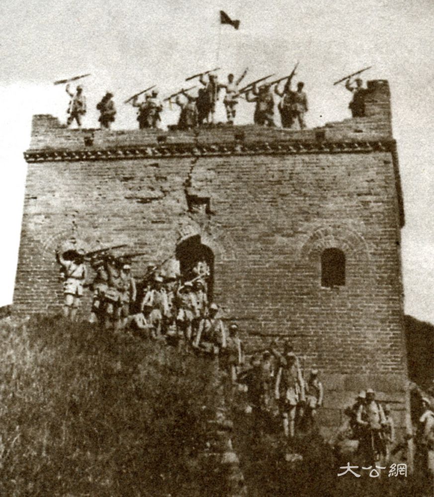 图:抗日战争时期一九四○年“百团大战”,八路军战士在涞源东团堡长城烽火台上欢呼胜利