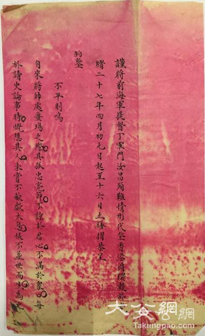 丁汝昌殉难六年之后,一九〇一年五月二十六至六月二日,香港《循环日报》——由近代思想家王韬创办,近代第一张宣扬改良思想,也是中国人最早自办的中文日报,在海内外具有广泛影响—连载了一篇题为“不平则鸣”,署名“沧海散人”,身为“甲午余生”者的文章,为丁汝昌鸣冤叫屈: