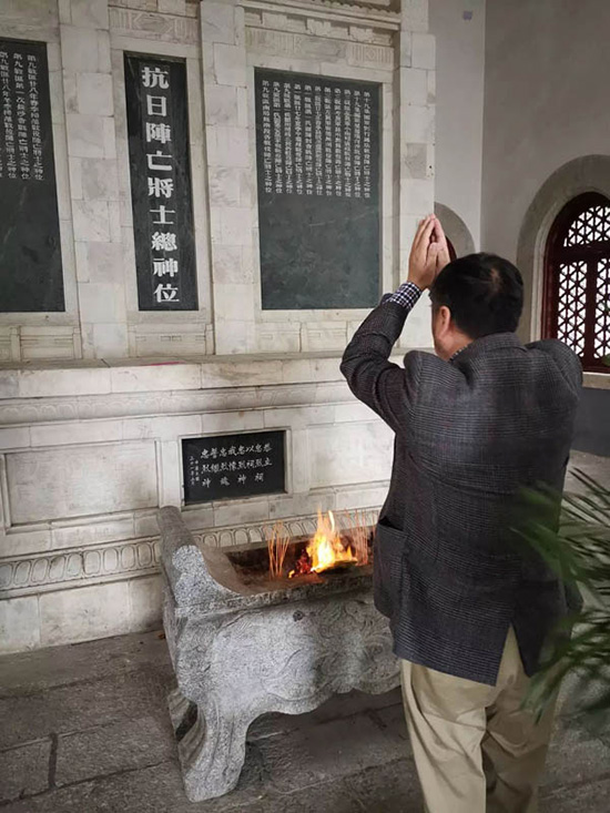 我们走进巍峨森严的忠烈祠,立即感到一股历史的厚重感、沧桑感扑面而来,整个忠烈祠的建筑群仿南京中山陵而建,正中绿草丛中静躺着巨大的民族英烈四字,我们虔诚地沿两边的石阶拾级而上,进入殿中,面对黑底白字的“抗日阵亡将士总神位”,似看到抗战牺牲的365万英灵在此聚集,似听到他们国破山河在的悲怆呐喊!我们满怀敬意地鞠躬叩拜,由于看到祠内严禁烟火的警示牌,我们特意与祠内工作人员商量,表达了欲给英烈们点香及烧些纸钱的愿望,工作人员听闻我们特意从浙江赶来千里拜忠魂,特许我们点了香烧了纸钱。