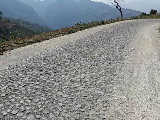 在保存完好的一段著名的塘石路路面,我们下了车,仔细地端详着历八十年风雨沧桑而不改旧样的滇缅公路,路面的设计恐怕为目前国内所仅有,石头被深埋地下,而露出地面的是整齐划一的小方石,崇山峻岭间,既可防止汽车轮胎打滑,又可避免雨水冲垮了路面。