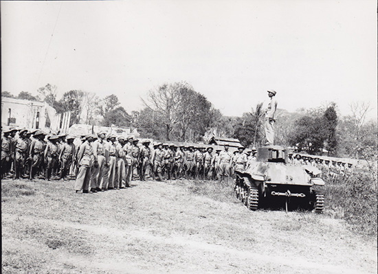 五十师师长潘裕昆将军站在缴获的日军坦克上对官兵发动员令地点:缅甸西保
