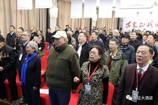 从左至右周恩来总理侄女周秉德、张自忠上将嫡孙张纪祖、远征军司令长官卫立煌上将孙女卫修宁、李鸿将军儿子李定国在远征大酒店大声同唱《不死的中国》