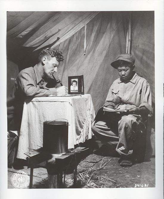 译者配图:1944年10月24日,SC 26142 中国 昆明,在怒江前线,在他的小帐篷“家”中,加州洛杉矶的通信兵摄影师乔治·寇科瑞克(George L.Kocourek)技术军士正在给美国的家中父老写信,名叫“明克(Mink)”的中国小朋友在一旁静静地阅读杂志。CBI-44-61285 摄影师:爱德华·迈克尔米科(Edward R.McCormick)。 / 美国国家档案馆图片