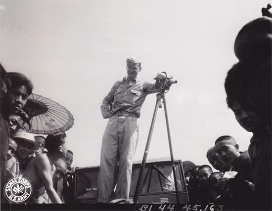 译者配图:1944年11月19日,缅甸 八莫南郊, 来自华盛顿州的美军通信兵164照相连摄影师唐纳德·普林格尔Don B. Pringle一等兵在拍摄影片时被一群中国驻印军新38师的步兵们好奇地围观。