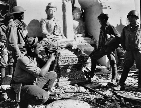 译者配图:丹.诺瓦克Dan Novak进行拍摄工作时,被战友拍摄下来。[1945年1月16日 SC 316949 明尼苏达州的丹尼尔·诺瓦克(Daniel Novak)技术军士,隶属于第164通信兵摄影连(164th Signal Photo C.),正在刚刚攻克的缅甸南坎拍摄中国驻印军新1军的军官们视察一座缅甸佛寺废墟的场景。IBT-45-80379 摄影师:谢瑞尔(Shearer) 美军通信兵(U.S.Army Signal Corps)拍摄