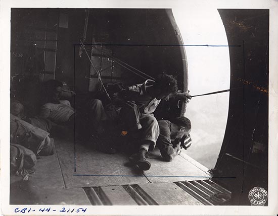译者配图:获得一枚空军奖章的威廉姆.萨佛兰William Safran,在密支那上空的一架C-46上拍摄地面的战斗实况。 / 美国国家档案馆图片