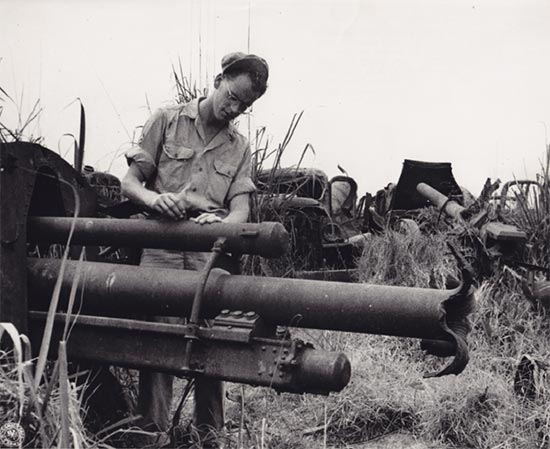 译者配图:1944年4月20日,缅甸某地 164照相连摄影师戴维.奎德David L. Quaid中士在查看一门被1942年撤退的史迪威将军遗留下来的4英寸炮。