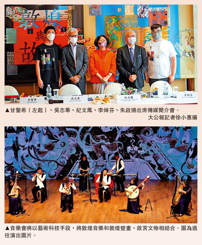 上图:甘圣希(左起)、吴志华、纪文凤、李焯芬、朱启扬出席传媒简介会。\大公报记者徐小惠摄;下图:音乐会将以艺术科技手段,将敦煌音乐和敦煌壁画、故宫文物相结合。图为过往演出图片。
