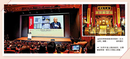 图左:“共同守望人类的故宫”主题讲座现场,吸引三百余人聆听。图右:故宫博物院乾清宫悬挂“正大光明”牌匾。\资料图片