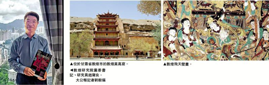 图左:敦煌研究院党委书记、研究员赵声良。/大公报记者刘毅摄;图中:位于甘肃省敦煌市的敦煌莫高窟。图右:敦煌飞天壁画。